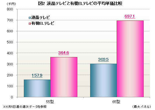 一方、6月5日週の販売実績をもとに従来の液晶テレビと有機ELテレビの平均単価を55型で比較すると、液晶テレビが15万円台なのに対し、有機ELテレビは36万円台と、2倍以上の価格差となっている(図2)。また、液晶テレビ全体の販売台数と比べると、有機ELテレビの販売台数は100分の1にも満たず、テレビ市場にもたらす影響はまだまだ小さい。