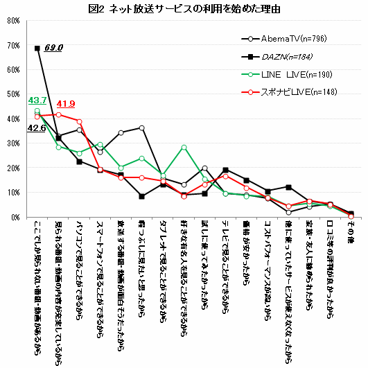 これはサービスの利用を始めた理由からも明らかで、「ここでしか見られない番組・動画があるから」が全てのサービスで4割以上の回答を集め、最も高い比率となっている(図2)。この要因はリアルタイムで見られるというだけでなく、それらの番組・動画の多くは各ネット放送サービスが独占して放送・配信している点も影響している。例えば、この項目で7割近い比率となったDAZNは、サッカーJリーグ全試合の独占放映権を持っており、AbemaTVはバラエティ番組やドキュメンタリーを中心に多くのオリジナルコンテンツを制作している。