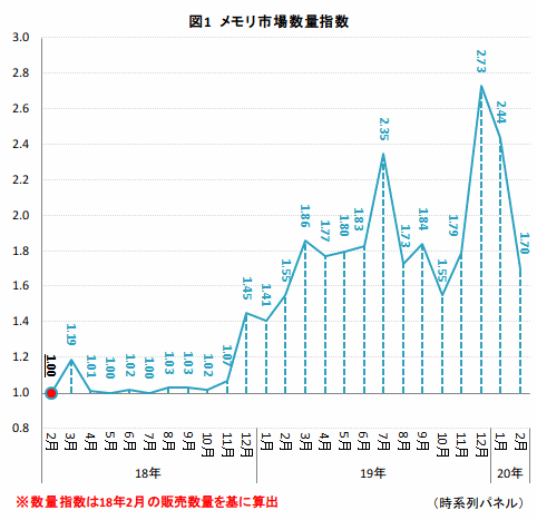 直近2年間のメモリ市場の動向をみるため、18年2月の販売数量を「1.00」とした数量指数を算出(図1)してみると、メモリの売れ行きが拡大し始めたのは18年12月からであることが分かる。18年2月から11月までの波形はほとんど変動していないが、12月には「1.45」を記録、一転して活発な動きをみせた。メモリの需要期は、じっくりと時間をかけてPCの自作や改造を楽しみたいとするユーザーが多いことから、比較的長期の休み取れる年末・年始やゴールデンウィークなどとなるが、19年2月の数量指数は「1.55」と、こうした需要期を上回り、その後も高い水準での推移している。特に19年7月は「2.35」、12月には「2.73」、翌1月も「2.44」と数量指数が2倍以上を記録する月も出てきた。