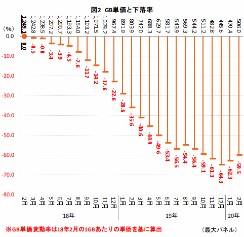 18年2月のGB単価は「1249.1」で1000円を上回っていた(図2)。その後、月を追うごとにGB単価は下落しており、12月に「967.4」と1000円を割り込む。図1で示したように、売れ行きが拡大し始めたのはちょうどこの時期にあたる。これを境にGB単価の下落は加速、19年6月には500円台、12月には「445.6」まで下げた。しかし、20年1月に入ると若干反発し「470.4」、翌2月には「506.0」と再び500円を上回っている。19年の前半で急落していたGB単価にブレーキがかかり、ここ3カ月で潮目が変わったことが、GB単価変動からも明らかだ。