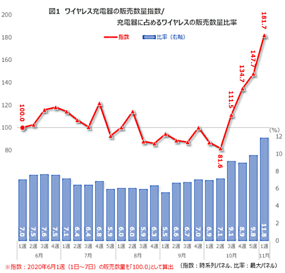 モバイルデバイスを充電するために必要な充電器や充電アダプタ。そうした充電器の中でも、Qiなどを含むワイヤレス充電器の販売数量が増え始めている。2020年6月1週(6/1-6/7)のワイヤレス充電器の販売数量を「100.0」として指数化したところ、10月3週(10/12-10/18)以降、急増していることが分かった(図1)。10月2週(10/5-10/11)までの数量指数は、緩やか下降基調で推移していた。しかし、iPhone 12シリーズとほぼ同時期にアップルの「MagSafe充電器」が発売になったことをきっかけに、週を追うごとに数量指数は上昇。10月は3週以降、「111.5」「134.7」「147.7」と右肩上がりで推移し、11月1週(11/2-11/8)には「181.7」と6月1週の約2倍に迫る販売数量となっている。