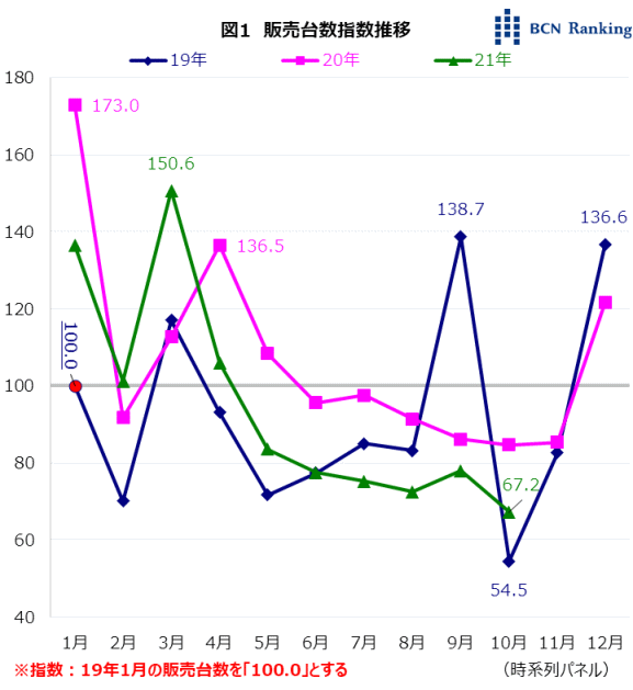 19年10月に消費税率が8%から10%に引き上げられる前、駆け込み需要が9月に発生し、同年1月を「100.0」とした販売台数指数で、同月は138.7に達した。消費増税後は反動減により54.5まで落ち込んだものの、20年1月のWindows 7のサポート終了(Win7 EOS)に伴う買い替え需要が立ち上がり、20年12月は136.6まで回復、翌月は173.0と期間中最も高い指数となった。