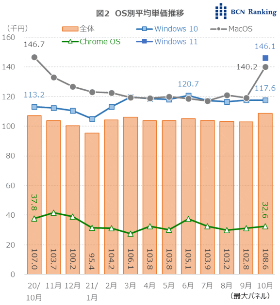 ノートPC市場の平均単価はここ一年、10万円前後と安定した推移を示している。OS別の平均単価を算出してみると、約7割を占めるWin10搭載の平均単価は11-12万円の間で推移していることが影響している。一方、2割程度を占めるMacOS搭載PCでは、平均単価の変動が激しい。20年10月と21年10月で14万円台を超えたのはMacBook Proが平均単価を押し上げたためだ。3万円台で推移するChrome OS搭載PCは、安価にも関わらず販売台数の増加がみられない。21年10月からWin11搭載PCが徐々に発売になっているが、14万6000円台とWin10搭載PCと比較すると3万円近く差があることが分かった。