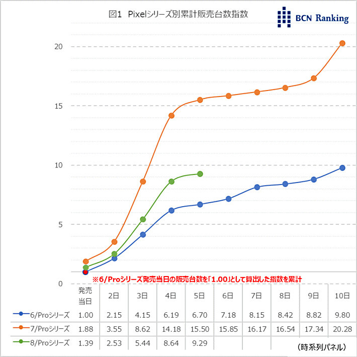 2023年10月12日にPixel 8、Pixel 8 Pro(以下、8/Proと表記)が発売となった。家電量販店・ネットショップの実売データを集計する「BCNランキング」を使い、累計販売台数指数をもちいて、6/Proと7/Proと比較した。すると、6/Proよりも出だしは好調だったが、7/Proには及ばなかったことが明らかになった。