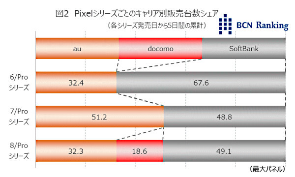 Pixel 6/Proシリーズ('21/10/28発売)の発売当日の販売台数を「1.00」として指数を算出。'22/10/13発売の7/Proシリーズ、'23/10/12発売の8/Proシリーズについて、発売5日間の累計販売台数指数で初動を比較した。今年発売の8/Proは、2年前の6/Proを上回る初速となったが、7/Proには及ばない結果となった。6/Pro、7/Proは、auとSoftBankの2キャリアからの発売だったのに対し、今回の8/8Proは前での2キャリアに加え、docomoからも発売となっていることを考えると、手放しでは喜べない結果と言えるだろう。