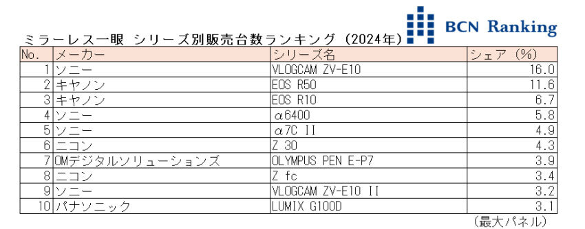 2024年に売れたミラーレス一眼TOP10、ソニー「VLOGCAM ZV-E10」が2年連続首位