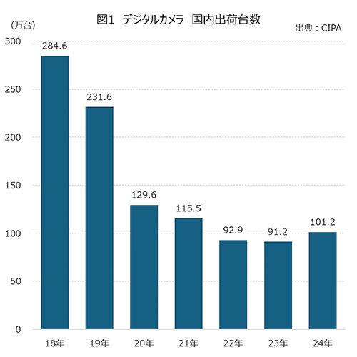 先日、CIPA(一般社団法人カメラ映像機器工業会)から2024年12月のデジタルカメラの出荷台数が発表された。18~24年までの出荷台数の推移と種類別出荷台数構成比を算出した。また、家電量販店・ネットショップの実売データを集計する「BCNランキング」でも、種類別販売台数構成比を算出した。出荷ベースのCIPAと販売ベースのBCNランキングでは、構成比が異なる傾向であることが分かった。