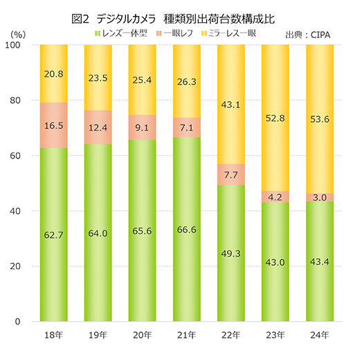 次に18~24年の種類別出荷台数構成比を算出した。21年までは、レンズ一体型が6割、一眼レフは1割、ミラーレス一眼が2割超という構成比で推移していた。しかし、22年に入るとミラーレス一眼が急増。23年にはレンズ一体型を上回り、24年は53.6%と過半を占めるまでに増加した。