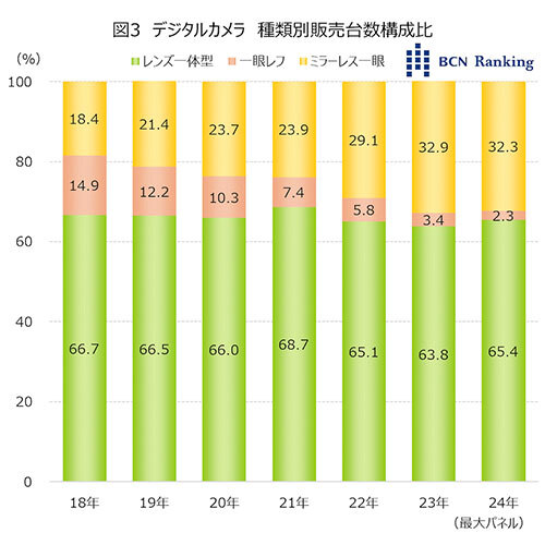 ここからは、BCNランキングによる実売データの動きをみていく。18~24年の種類別販売台数構成比をみると、レンズ一体型が6割超を占める。ミラーレス一眼は18年の18.4%から24年の32.3%と、年々構成比が増加しているものの、3割どまり。先に提示した種類別出荷台数構成比とは、明らかに異なる動きを示している。この二つの数値からわかるのは、メーカーと消費者の意向が乖離しているということだ。メーカー側は、レンズ一体型よりも高価なミラーレス一眼に主軸を移しつつあるということ。一方、消費者はレンズ一体型を欲しているということだ。