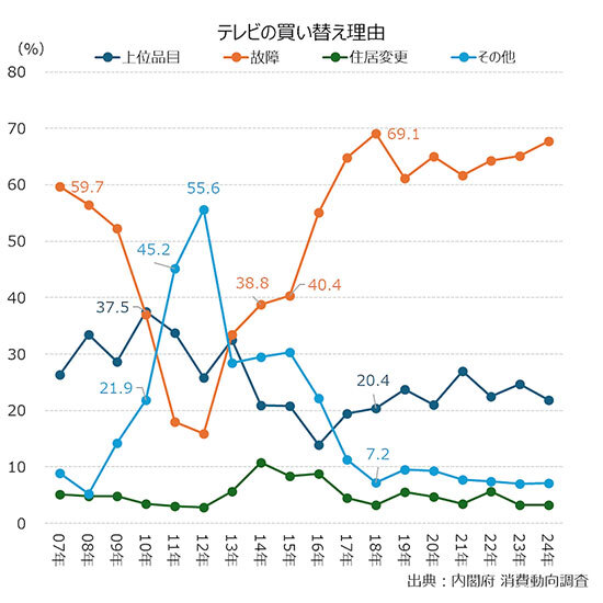 内閣府の消費動向調査の数値を用い、総世帯におけるテレビの買い替え理由をグラフ化した。