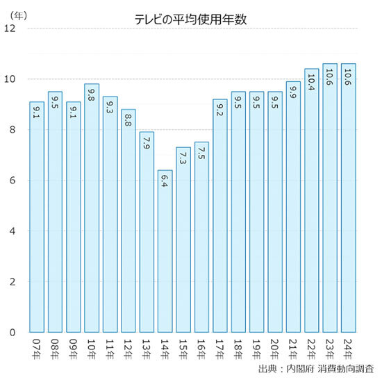 テレビの買い替え理由は「故障」が7割近くと最も高い比率だ。より良い製品に買い替える「上位品目」は2割程に過ぎず、50ポイント近い開きがある。また、2014年からテレビの平均使用年数は長期化し、22年に10年を超えたことが内閣府の消費動向調査から明らかとなった。