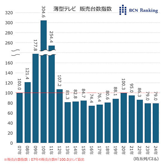 次に、家電量販店・ネットショップの実売データを集計する「BCNランキング」を用い、07年の販売台数を「100.0」とした薄型テレビの販売台数指数を算出した。