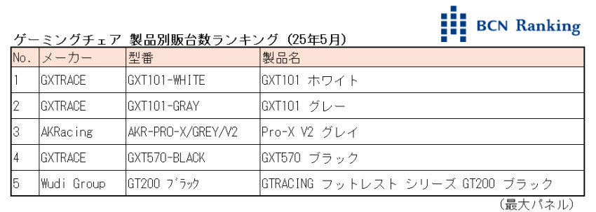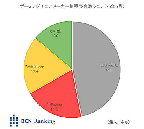 2025年5月のゲーミングチェア市場で、GXTARCEのメーカー別販売台数シェアが4割を超えた。AKRacingや、「GTRACING」ブランドを展開するWudi Groupが後を追う。家電量販店・ネットショップの実売データを集計する「BCNランキング」から、25年5月のゲーミングチェア市場を振り返る。