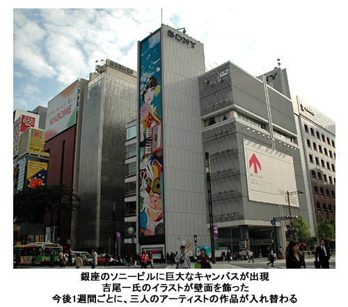 ソニービルに飾るイラストは、10月16日から展示し1週間ごとにアーティストが変わる。第1弾としては、10月16日から吉尾一氏制作のアコーディオンを持った、ドレス姿の女性のイラストが披露された。