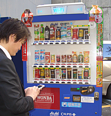 アサヒ飲料は、アサヒカルピスビバレッジが展開する自動販売機に無料ワイヤレス通信サービス「FREEMOBILE」を搭載し、自動販売機周辺を無料のWi-Fiスポットにする展開を2012年に開始する。飲料メーカーとして初の試み。