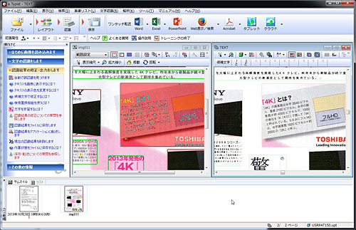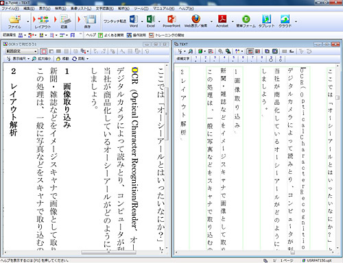 認識範囲の設定が終わったら、「認識」ボタンをタップする。すると、認識エンジンがチェックを行い、ウインドウ左に元原稿、右側に同じレイアウトのテキスト文書を表示する。元原稿の表示範囲や表示サイズを変更すると、それに合わせてテキスト文書のエリアも変更されるので、左右並べて認識結果をチェックすることができる。