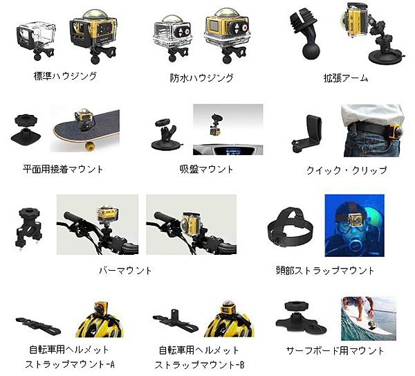 サイズは、高さ50×幅41.1×奥行き38mmで、重さは約103g。カラーはイエロー。2mの耐衝撃、IPX5相当の防滴、IP6X相当の防じん、-10℃までの耐低温性能を備える。別売のマウントアダプタを使って、自転車やクルマのフロントガラス、サーフボード、ヘルメットなどに取りつけて撮影できる。別売のマウントアダプタの税別実勢価格は、防水ハウジングや拡張アーム、平面用接着マウント、吸盤マウント、バーマウント、頭部ストラップマウント、自転車用ヘルメットストラップマウント、サーフボード用マウントなどがセットで2万円台半ばの見込み。