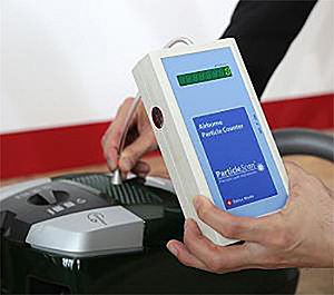 床だけでなく空気もきれいにするので、窓を開けずに掃除できる。外から入ってくる花粉を心配することなく掃除でき、また排気口が上に向いているので、床面の花粉を巻き上げることもない。昨年開催した発表会で行ったデモンストレーションでは、会場の空気中に0.3μの微粒子が約4万~10万個検出されたが、ミーレ紙パック式掃除機の排気口に空中浮遊粒子カウンターを近づけると、カウンターの数値が「0」になった。