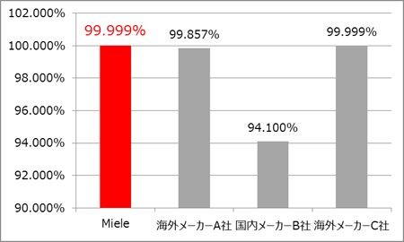欧米をはじめ、国際的な掃除機の性能基準「ダストピックアップ率」に準拠。第三者機関が、一定面積のカーペットなどに、一般家庭を想定した規定量のゴミを巻き、一定のスピードで吸い続けることで、どれだけゴミを集めることができるかどうかを計測した結果、ミーレの紙パック式掃除機は、調査したすべてのキャニスター掃除機のなかでトップだった。