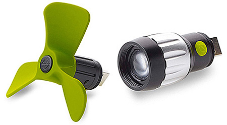 付属のUSB扇風機アタッチメント(左)とUSB懐中電灯アタッチメント