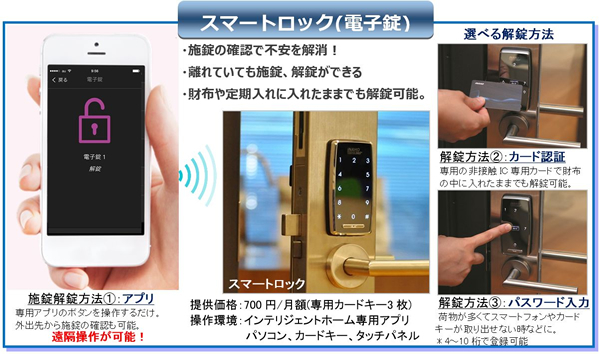 スマートフォン向けの専用アプリを使った施錠確認や施錠、解錠に対応し、付属のカードキーや暗証番号入力でも解錠が可能な電子錠。解錠時に家電コントローラーと連動して、照明やエアコンをオンにしたり、子どもの帰宅時間に解錠されるとIPカメラで撮影してメールで知らせたり、目的に合わせて自由にルールを設定できる。