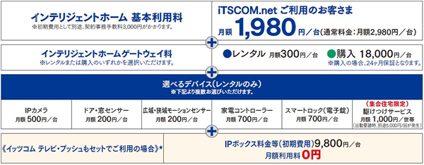 ドアや窓の開閉を知らせる「ドア・窓センサー」や、人の動きを検出して知らせる「モーションセンサー(広域・狭域)」、センサと連動して映像を記録する「IPカメラ」、メーカーを問わずエアコンや照明のオン/オフが可能な「家電コントローラー」を用意するほか、災害時など緊急時のテレビ自動立ち上げ機能を備えた「イッツコム テレビ・プッシュ」や、東急セキュリティとの連携による警備員の「駆けつけサービス」の提供も行う。