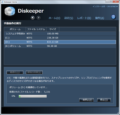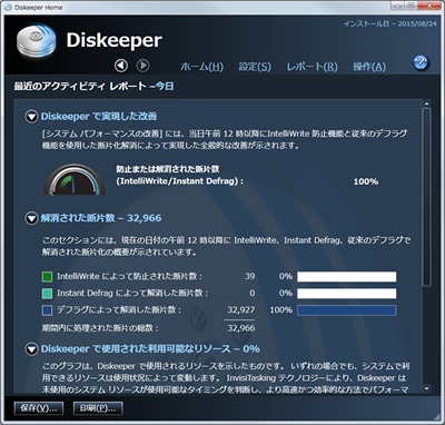 「Diskeeper 15J」を実行 修復された断片化は3万以上!