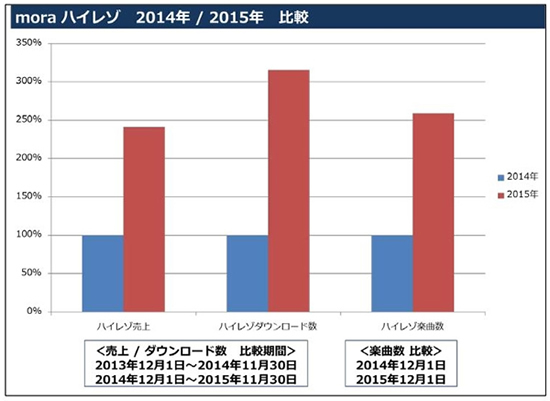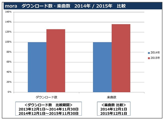 「mora」におけるダウンロード数、楽曲数の2014年/2015年比較