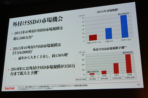 発表会の冒頭に登壇したSSD/USB担当プロダクトマーケティングディレクターのフィリップ・ウィリアムス氏は、「2015年の世界ストレージ市場は 外付けHDDが約5500万台と大勢を占めているが、2015年の外付けSSD市場は27万6000台。対前年比で約136%伸張しており、2018年に は外付けSSD市場が350万台まで拡大する」と説明した。