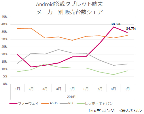 今や国内のSIMフリースマートフォンで1位、2位を争うトップメーカーになったファーウェイ。実はスマホだけでなくSIMフリーのタブレット端末も好調だ。家電量販店の実売データを集計した「BCNランキング」によると、今年8月にシェア38.3%を占め、初めてAndroidタブレットのNo.1メーカーに躍り出た。9月も、SIMフリースマホでもライバルであるASUSを抑え、シェア34.7%でトップに立った。今回は、販売中のタブレットの主要モデルを紹介しながら、その人気の秘密を探る。