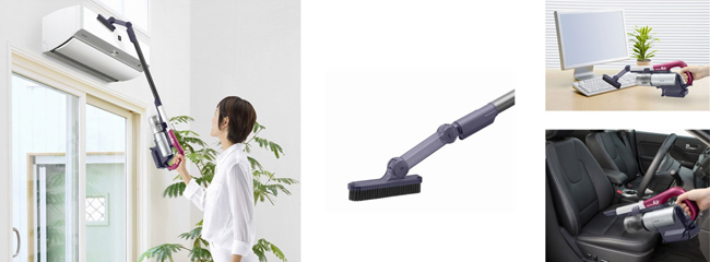 カーボンパイプ先端に付属の「はたきノズル」を装着すれば、これまで掃除が面倒だった高い場所のホコリを軽快に吸い込むことができる。また、パイプを外し、「はたきノズル」や「すき間ノズル」を装着すれば、PCのキーボードなど凹凸のある場所や、車の中も簡単に掃除できる。
