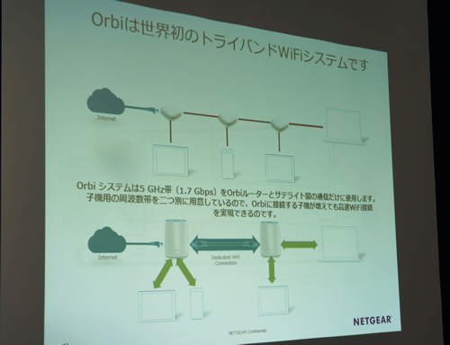 ネットギアジャパンの曽利 雅樹マーケティングマネージャーは、「従来の仕組みでは、Wi-Fi接続している子機が中継機エリアに入っても、中継機に自動的に接続されず、引き続き親機と接続したままとなり、ルーターのエリアから出た際に中継機へつなぎ直すため、通信状況が途切れてしまっていた。Orbiなら自動的に最適なOrbiサテライトへ接続が切り替えられ、ルーターのエリア外に出ても中継機に接続されているため、途切れることなく通信できる」と、従来製品と比べた優位性をアピールした。