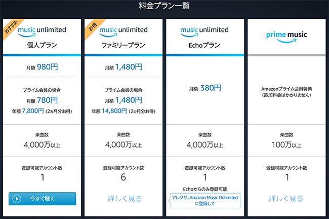 料金は個人プランが月額980円、最大6アカウントまで登録可能なファミリープランが月額1480円、Echo所有者限定のEchoプランは月額380円。プライム会員だと割引が適用され、個人プランは月額780円または年額7800円、ファミリープランは月額1480円または年額1万4800円となる。個人プラン、Echoプランのみ30日間の無料体験が可能。