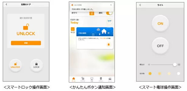 選択可能な「au HOMEデバイス」として、睡眠状態がわかる「睡眠モニター 01」、外出先から玄関の鍵を解施錠できる「スマートロック 01」、ワンタッチで「au HOME」に通知可能な「かんたんボタン 01」、外出先からオン/オフを切り替えられる「スマート電球 01」、異常を感知するとスマートフォンに知らせる「火災報知器アダプタ 01」を追加した。