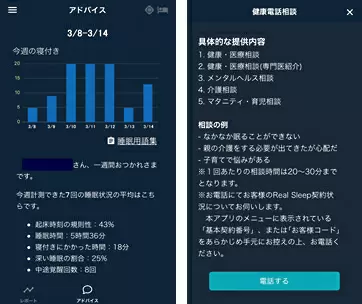 「Real Sleep」は、ニューロスペースと共同開発して提供するサービスで、睡眠時間、睡眠ステージ、身体の動き、心拍数、呼吸数といった睡眠データの記録し、日・週単位で表示して睡眠状態を可視化できる。さらに、月額300円の「アドバイスオプション」契約者には、睡眠データの分析を元にした週1回の「アドバイス」と、健康相談、専門医紹介、メンタルヘルス、介護、育児の悩みについて、専門士(保健師、管理栄養士等有資格者)に電話で相談可能な「健康電話相談」を提供する。