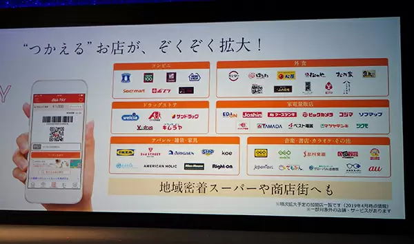 au PAYが利用できる対象店舗は、4月4日時点で53社でスタート。コンビニやドラッグストア、飲食店のほか、家電量販店でエディオン、上新電機、ケーズデンキ、ビックカメラ、コジマ、ソフマップ、ベイシア電器、ヤマダ電機、ベスト電器、マツヤデンキ、ツクモ、キタムラ、ゲオなどに対応。対応店舗は順次拡大していく。