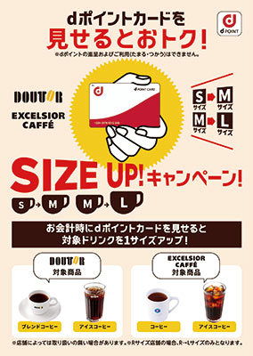 「dポイント」サービス開始を前に、カウントダウンキャンペーン「dポイントカード提示でコーヒーを無料サイズアップ!」を開催する。第1弾は4月22日~4月28日、第2弾は5月24日~5月31日。ドトールコーヒーショップ、エクセルシオール カフェで各種dポイントカードを提示すると、対象商品(アイスコーヒー・ホットコーヒー)に限り、SはMに、MはLにそれぞれサイズアップして提供する。サービス開始前のため、会計時にdポイントは貯まらない。