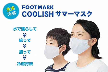 フットマーク クーリッシュサマーマスクは、これから暑さが予想される夏場のマスク対策として二層式の独自の冷感素材を使用したマスク。独自開発の3種類の糸が気化熱を効果的に発生させ、冷感効果を発揮する。一般的な接触冷感とは違い、水分(水、汗、お湯でも可)を含ませ絞って振ることで、何度でも生地温度が低下する。紫外線遮蔽率(UVカット)が98%、紫外線保護指数(UPF)が50+。洗っても機能性は変わらない。