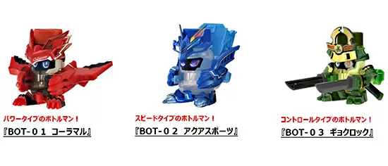 3種の機体は、ペットボトルキャップを本体にセットし、後ろ側にあるトリガー(バー)を押し込み発射することで、射的やバトルを楽しむことが可能。パワー・スピード・コントロールの三つの射撃タイプがあり、1機種1能力を搭載している。子どもが大好きな発射の爽快感が味わえるほか、それぞれ飲料をモチーフにし、コミカルで小学生が格好いいと思えるデザインになっている。
