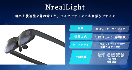 NrealLightは、中国Nreal(エンリアル)と共同開発した製品で、重さ約106gの軽量と眼鏡のように折りたためるコンパクトさが特徴。スマホと接続するタイプのため、持ち運びができ、場所を選ばずに使える。