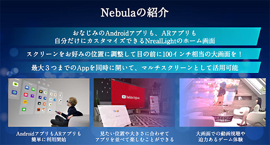 機能面では、従来のAndroidアプリをグラス内で起動して、プライベートなセカンドスクリーンとして利用できる「ミラーリングモード」や、グラス内で空間上に映像を映し出す「MR(Mixed Reality)モード」を搭載する。これによって、3m先に100インチ規模のプライベートな仮想スクリーンがあるような映像を楽しむことができる。