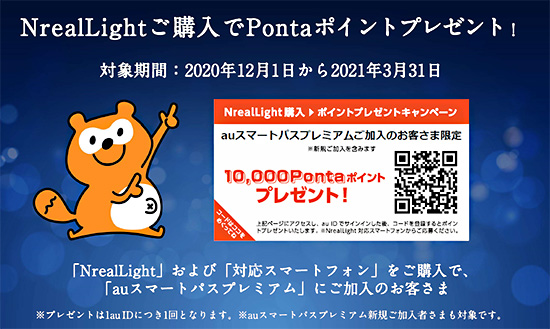 発売を記念して、12月1日~2021年3月31日まで1万Pontaポイントがもらえるキャンペーンも実施。期間中にNrealLightと対応スマホの購入(既に購入済みでも可)、auスマートパスプレミアムに加入していることが条件となる。
