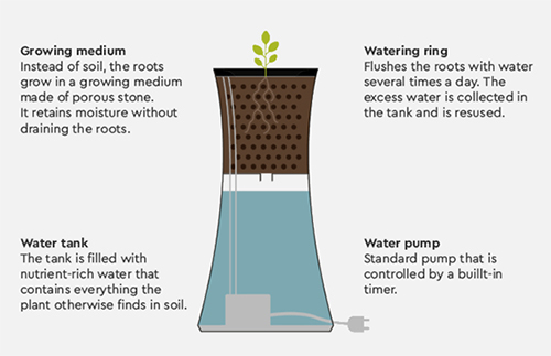 ボタニアムが素晴らしいのは、水耕栽培でありつつハイドロボールという石を使う点だ。水の管理を自動化してくれる水耕栽培ガジェットは多いが、石を使うというのは珍しい。ハイドロボールはLECAと呼ばれる粘土由来の人工石。高温で焼いて発泡させることで半永久的に使用でき、かつ常に栄養素豊富な水を一定の割合で内部に保つ性質がある。このため、自動散水された水はハイドロボールに染み込み、常にベストな水分環境が保たれるというわけだ。溢れた分は再びタンクに戻って行くので限られた水量を効率よく利用するがきるようにもなっている。