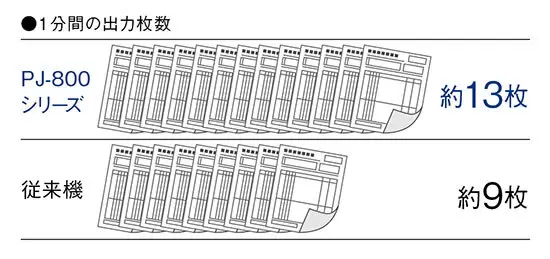 新製品は印刷速度が向上。従来機種の速度は約9枚/分だったが、新製品では約13枚/分とスピードが約1.4倍にアップしている。スピーディーな印刷を実現し、客先で相手を待たせることもない。用紙はA4、A4ロール紙、A5、レター、リーガル、カスタムに対応。