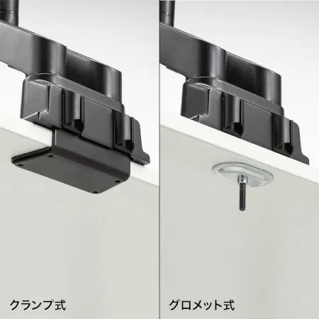 設置方法は、デスク天板を上下から挟み込んで設置するクランプ式と、天板に穴をあけてボルトを通し天板を挟み込むグロメット式の、どちらかが選択できる。