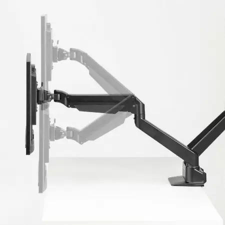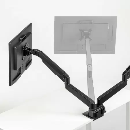 水平アームと、ガスシリンダーを内蔵した垂直アームを組み合わせており、使用する目線の高さに合わせて、少ない力で簡単に位置を変えられる。また、アームがそれぞれ独立して動くので、それぞれのディスプレイの位置を調整可能となっている。