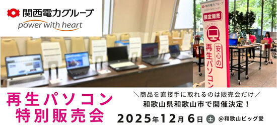 ポンデテック(関西電力グループ)が運営するPC nextは、12月6日に和歌山県和歌山市で「再生パソコン特別販売会」を開催する。