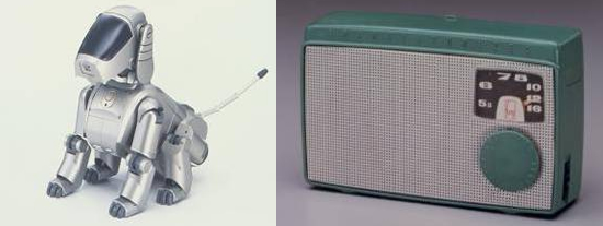 1999年発売の初代AIBO「ERS-110」(左)と、トランジスタラジオ「TR-55」