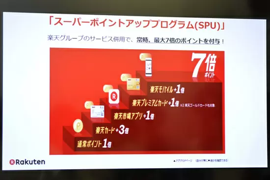 例えば、楽天が実施している「スーパーポイントアッププログラム(SPU)」は、楽天カードやアプリなどの使用状況に合わせて、ポイント還元率が増える制度。うまく活用すれば、最大7倍になる。