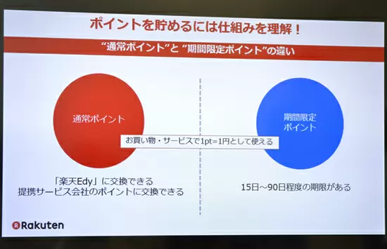 岡野氏が紹介したテクニックは3点。まず、「通常ポイント」と「期間限定ポイント」の違いを知ることだ。「期間限定ポイントは使用期限があるので、失効時期を過ぎないように気をつけて、優先的に使用するのがおすすめ」。ポイントを貯めるだけでなく、何に使うかまで戦略的に考えるのがコツとのことだ。